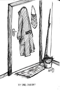 The bags hung from a hook I couldn’t reach, and it was these that slowed the swinging of my dad’s overcoat, when we came in and out. If my sister or I were coming in with our hands full, we’d shut the door by backing up to it and shutting it with our backsides. I can still remember the feeling of leaning back into the soft and slightly dusty folds of that long garment, and thinking that I could be leaning back against my dad. A lovely thought!